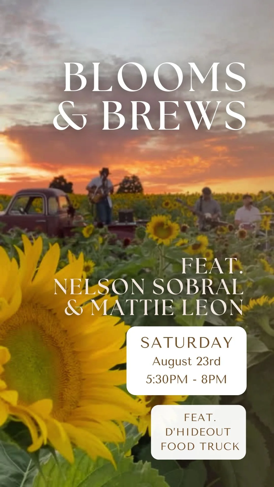 Join us for an evening where the beautiful sunflower blooms provide a backdrop for some great tunes and locally crafted brews. Nelson Sobral, guitarist and singer-songwriter will take stage with bluesy, R&B country-rock tunes and Mattie Leon, singer/songwriter, craftsman on guitar and piano, he refuses to leave the past behind, inspired by the songwriting of the sixties and seventies. A night you don’t want to miss! There will be drinks by Little Beast, as well as snacks to keep you rocking the evening away.