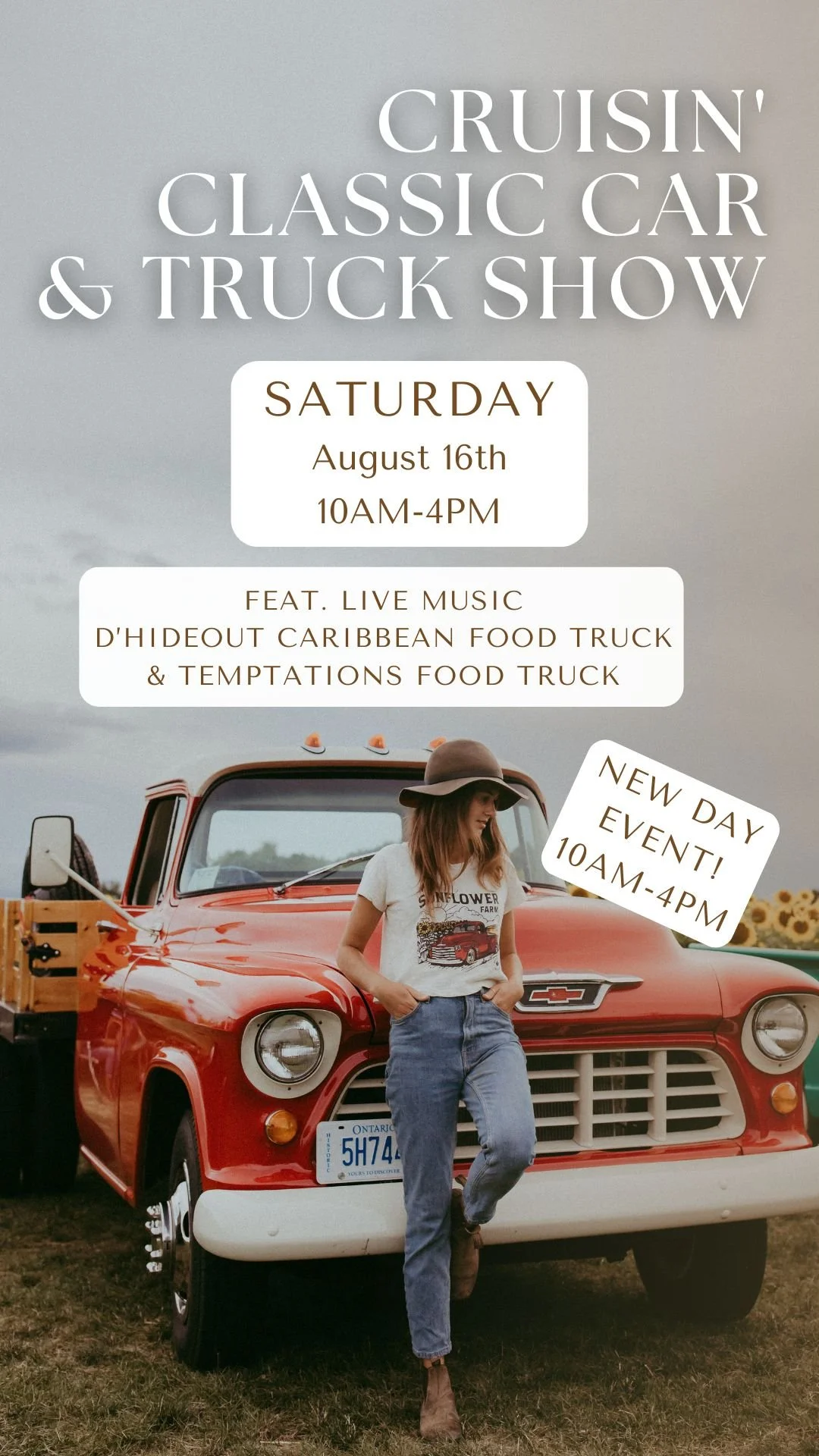 Back by popular demand! Join us for our annual Cruisin' Classic Car & Truck Show at The Sunflower Farm! New this year - join us for a day event from 10am-4pm of live music, food trucks, cold beverages and beer from a local brewery and a stunning vintage car & truck show set against the backdrop of our golden sunflower fields. Enjoy a selection of beers, food and rock, blues and country tunes from The 2nd Shift. Whether you're a car enthusiast or just looking for a fun day out, this event promises a perfect blend of automotive beauty, great music, and fantastic food. Bring your friends and family, don't miss out on this unique and unforgettable event!