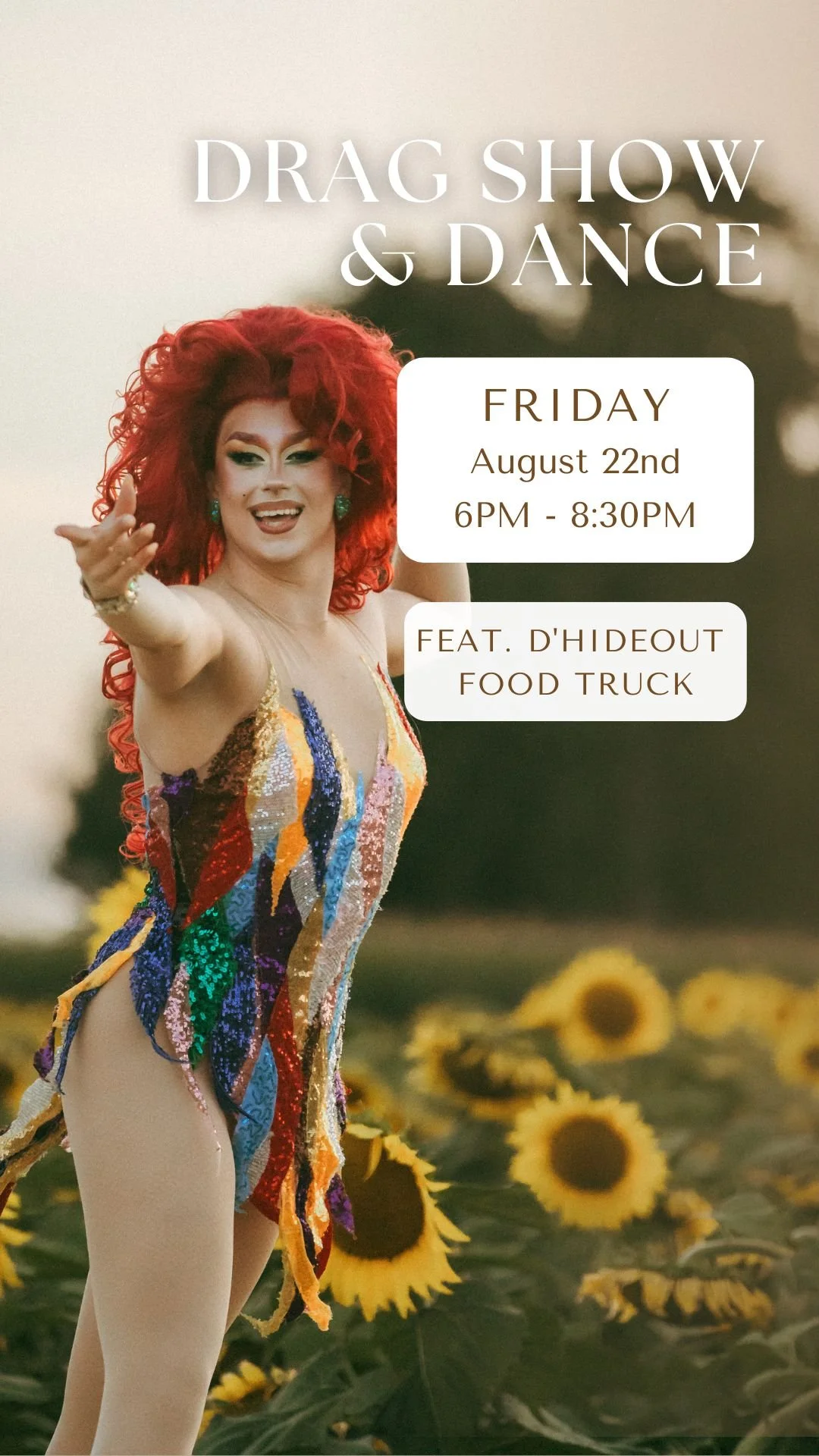 Back by popular demand! Join us for an evening where the beauty of nature meets the glamour of drag at The Sunflower Farm's second annual Drag Show & Dance! Prepare for an unforgettable evening of fabulous entertainment, dazzling performances, spectacular costumes, and electrifying music as we welcome three of the most talented drag queens from Toronto to take the stage. Join us down at The Sunflower Farm for an evening of fun, flair, and fantastic entertainment!